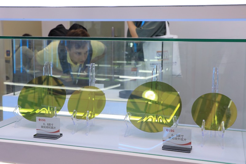 2023年7月1日,中国国际半导体设备、材料、制造展览会。晶盛机电展台,碳化硅衬底片,碳化硅外延片/IC Photo