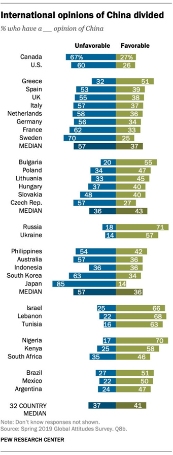 而对中国持有负面评价的比例在32个国家中最高高达85%