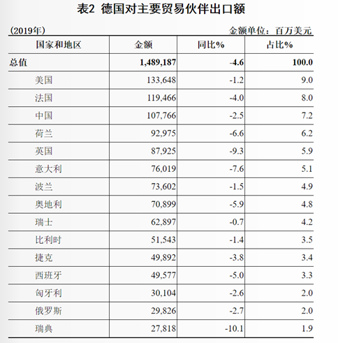 2019年法国的十大出口市场有八个是欧洲国家,其中德国排第一,金额远远高过其他国家。