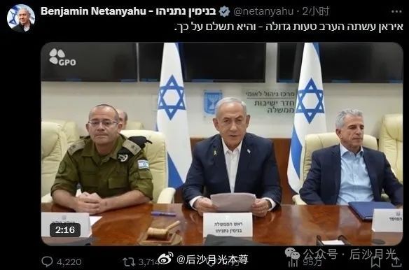 以色列总理内塔尼亚胡在地堡中声称:“伊朗今晚犯下大错,将为此付出代价。”