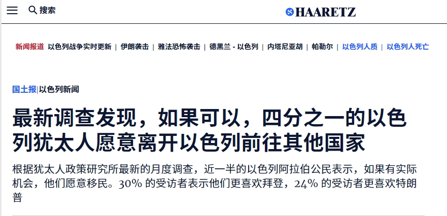 以色列《国土报》报道显示,四分之一以色列犹太人愿意离开以色列网络截图
