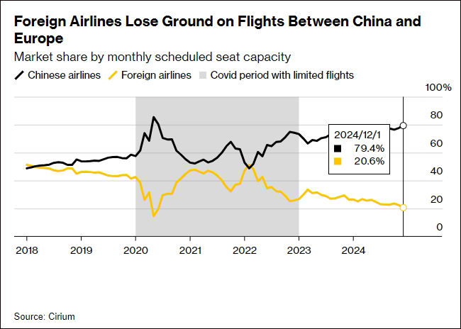 彭博社称,新冠疫情后,由于欧洲出境需求低迷,欧洲航空公司恢复飞往中国的航班进展缓慢。但与此同时,中国航空公司增加了许多中欧航班,远超2019年水平,并提供极具竞争力的机票价格。