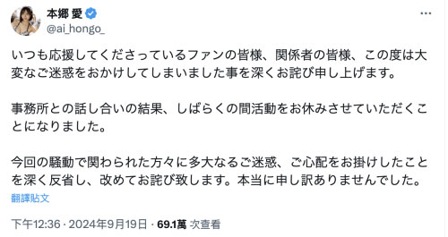 在上传影片说明与电玩实况主「加藤纯一」的不伦绯闻后,本乡爱刚刚宣布与事务所商量后决定休息一阵字,并再一次对造成骚动表达歉意⋯
