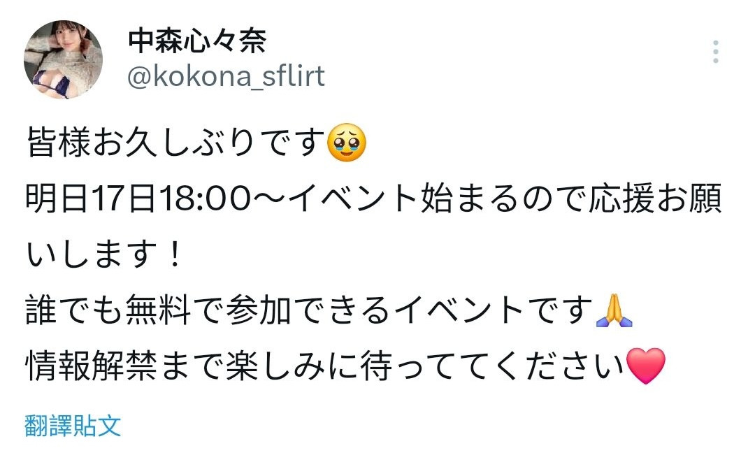 所以这位女演员现在到底什么状况?今天,她突然更新了中森心々奈的X(https://x.com/kokona_sflirt),我简单做个翻译: