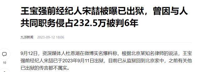 九派新闻——王宝强前经纪人宋喆被曝已出狱,曾因与人共同职务侵占232.5万被判6年