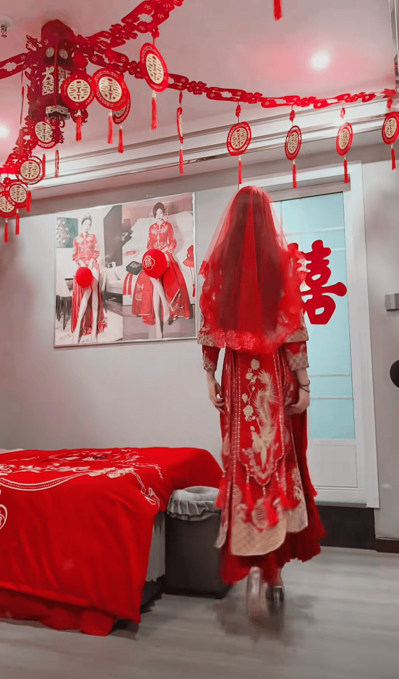 河南一位从事足浴行业的女子,同样也是这样,不仅穿着喜气洋洋的服装,而且就连包厢也打扮的像是婚房一般。