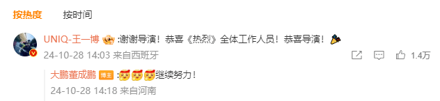 10月27日,导演大鹏(董成鹏)在社交平台发文恭喜王一博获金鸡奖最佳男主角提名,表示“恭喜王一博,一直努力就会成功!”10月28日,王一博在评论回复大鹏,表示“谢谢导演!恭喜《热烈》全体工作人员!恭喜导演!”据悉,在第37届中国电影金鸡奖提名中,电影《热烈》获得最佳故事片、最佳导演(大鹏)、最佳男主角(王一博)、最佳摄影(钟锐、钱添添)、最佳剪辑(屠亦然、张一博)共5项提名。
