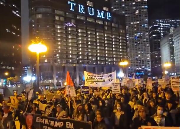 据CBS和FOX地方频道报道,选后第二天,即当地时间11月6日晚,巴勒斯坦支持者走上芝加哥街头抗议,期间还举起“权力还给人民”等口号,要求“特朗普滚出”。CBS称“美国巴勒斯坦社区网络”组织发起的这场抗议,是在联邦广场开始。不过,X平台上的视频和抗议信息显示,人群最终抵达了特朗普酒店。