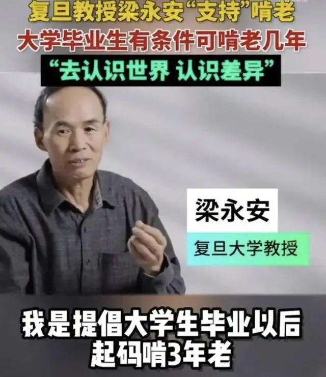 上海复旦大学中文系教授梁永安日前在一场秋季人才招聘会上表示,建议有条件的年轻人,大学毕业后「啃老」3年。此番言论在现今的中国社会环境引起一片哗然。