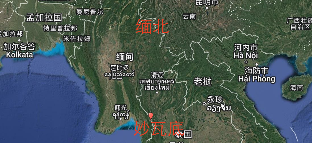这是自媒体的说法,其实官方公告里,一直在强调“中缅边境”,之前解决的是中缅边境一带的电诈园区。问题是缅甸这个国家就是前文说的那种有大量“边疆地带”的国家,他的周围都不太平。这次王星失踪的地方,离咱们老远,我去奥维地图上截了个图,那个妙瓦底在下边,之前清剿的是上边: