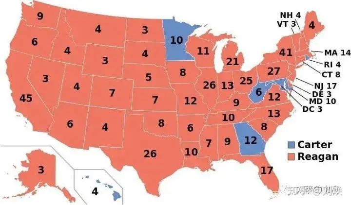 1980年,里根以489票的成绩淘汰了卡特;