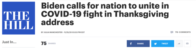 拜登感恩节前发表讲话,呼吁美国人民团结起来抗击疫情