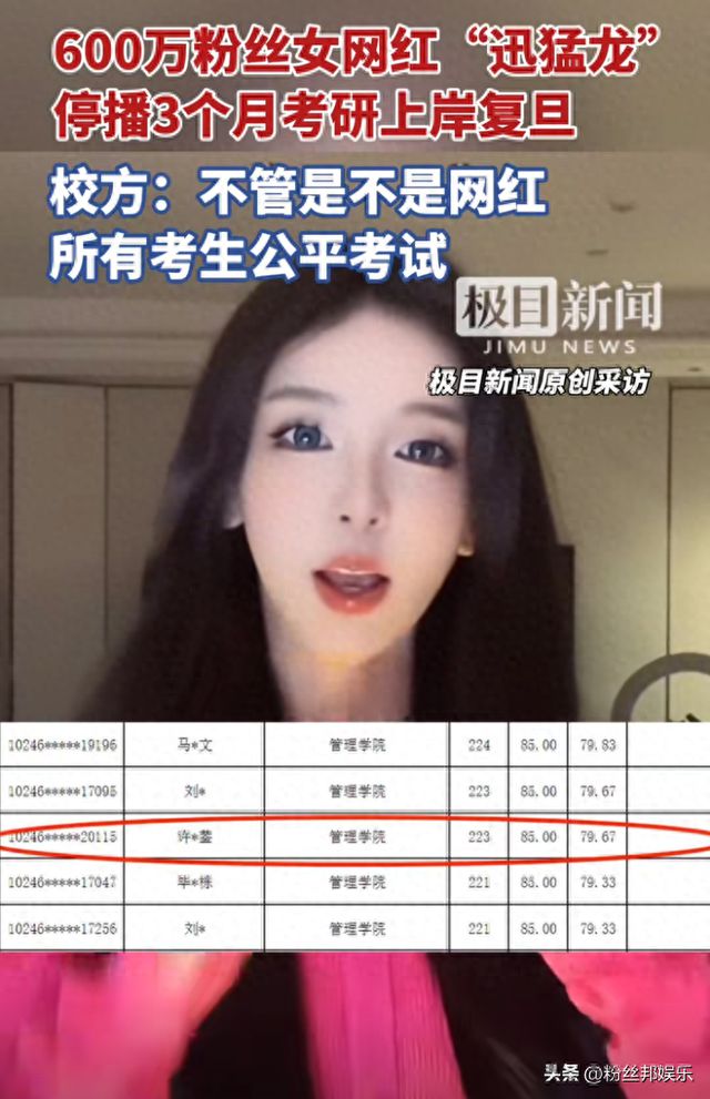 近日,女网红“迅猛龙特蕾莎”考上复旦大学冲上热搜第一,这位坐拥600万粉丝的抖音美女网红,以初试总分223分(管综140分+英语二83分)的成绩,被复旦大学管理学院拟录取为非全日制工商管理硕士(MBA),超国家线35分。