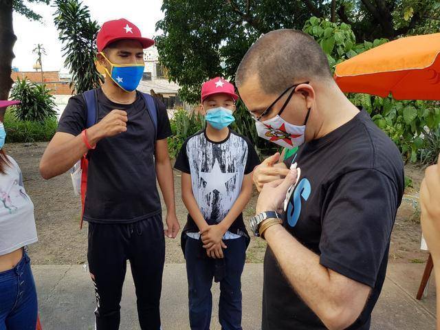 (图说:委内瑞拉外长阿雷亚萨(图右短发戴白色口罩)与选民交谈)