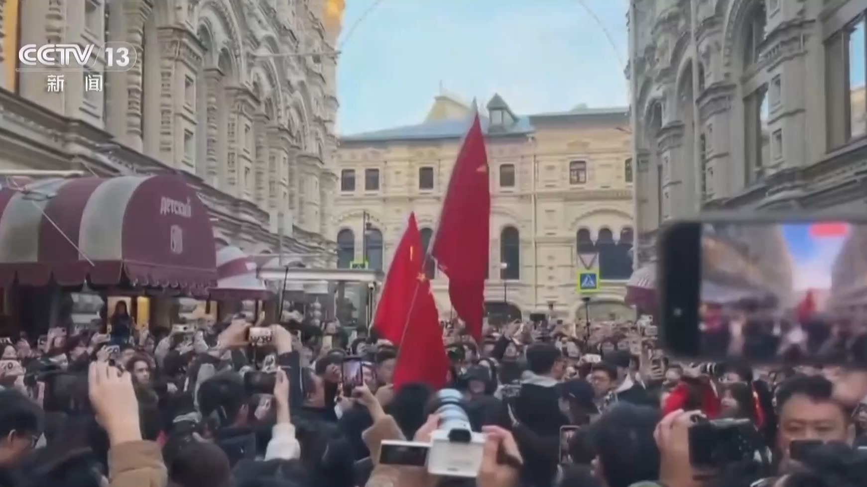 中国在俄罗斯留学生李冠瑶:同学们心情非常激动,在红场附近,我们自发弹起了吉他,开始唱爱国歌曲,我觉得这是一场关于家与国之间的深情告白。