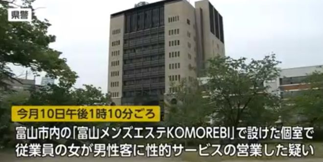 当天下午1点10分,富山县警方在店铺突袭过程中,发现一名19岁女子正在为一名男顾客提供非法性服务。警方立即将其以现行犯逮捕,并对现场设备、记录本与手机进行扣押。