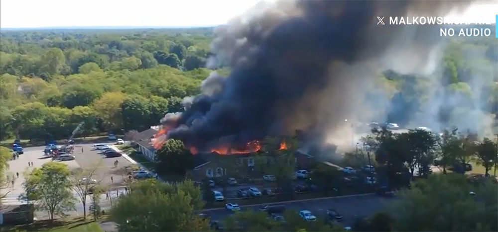 现场视频显示,枪击案发生后,该教堂燃起大火。 X网站截图