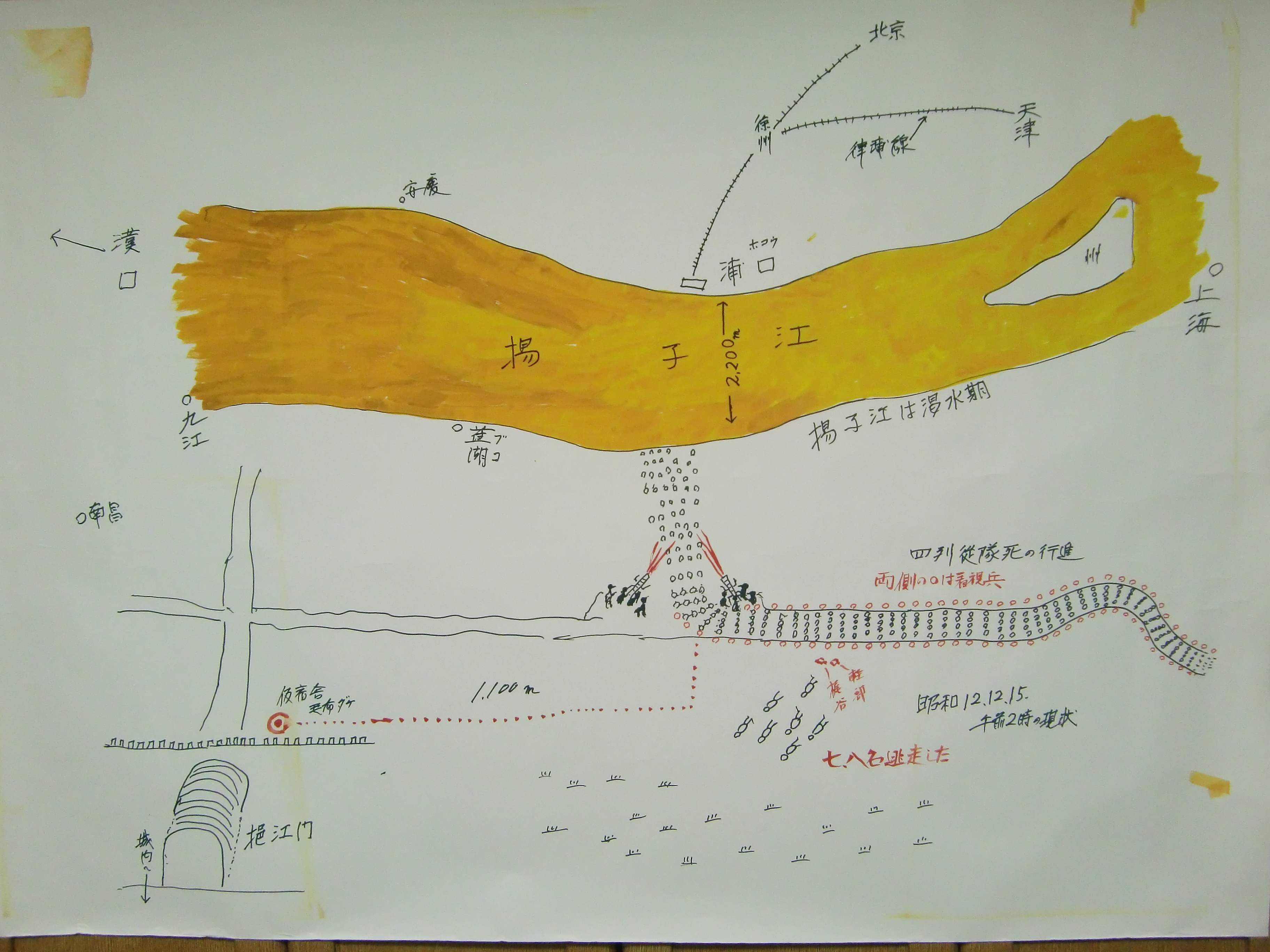 这处营房与士兵们仅相距1100米。12月15日夜里,听到激烈的机枪声响起后,他和名叫轻部的部下一起来到宿舍外。眼前的景象令他震惊:被抓的中国战俘,分成四列纵队,被日军严密包围着,朝着江边走去,两侧有重机枪持续扫射。这就像一条传送带,成批的中国人被杀害。多数集体屠杀是将人聚集在中间,然后从外围射杀;或是排成十几二十人的队列,把他们推入江里。