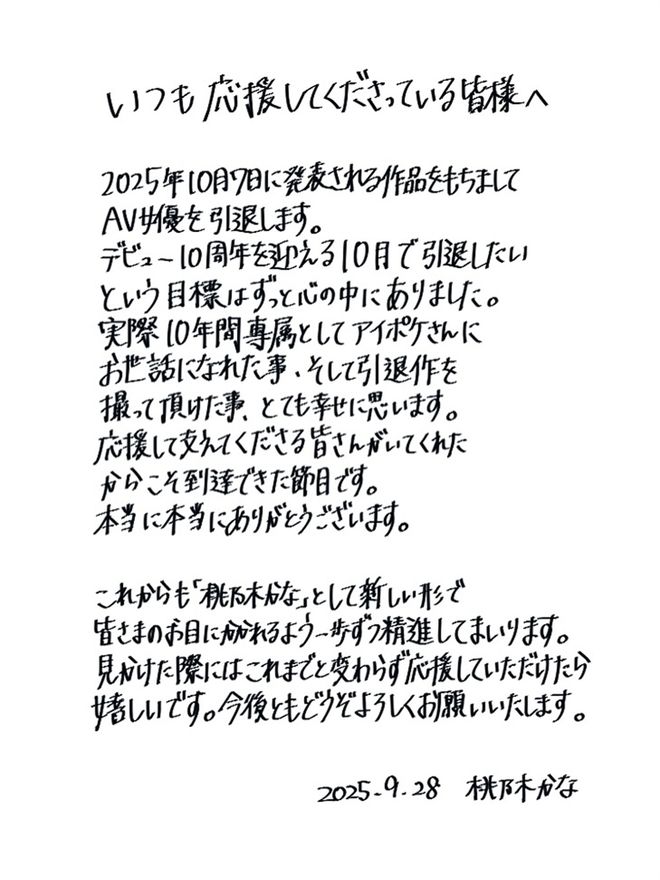 日本成人界抛出震撼弹!被粉丝封为「D槽女神」的超人气女优桃乃木香奈,昨(28日)深夜突然在Instagram公开一封手写信,宣布将于2025年10月7日推出最后一部作品后正式引退,结束长达10年的拍片生涯。消息曝光后不论是日本还是台湾的粉丝都十分不舍,不少人涌入留言区表示「我的青春结束了」、「谢谢妳这10年的陪伴」。