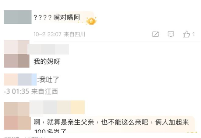 对于两个大男人做出如此亲密的行为,许多网友表示难以接受,纷纷留言吐槽:“我的妈呀!”“就算是亲生父亲也不能这么亲吧”“我吐了” 等,字里行间满是不适感。