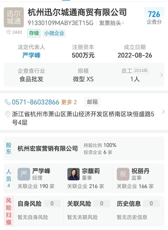 而且,严学峰目前还是宏胜系的总监,同时担任着杭州迅尔城通的法人。更巧的是,迅尔城通的董事正是宗馥莉。从这个商业链能看出来,严雪峰和宗馥莉关系匪浅。