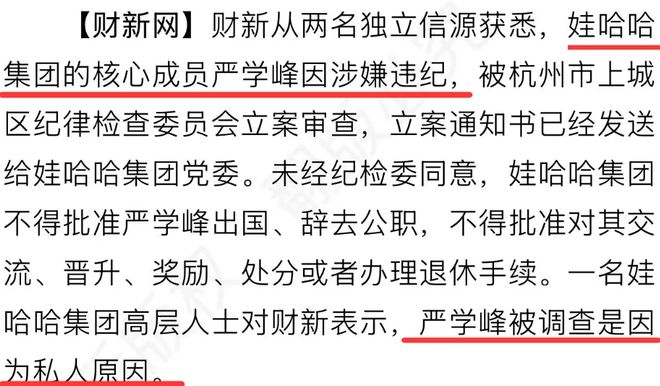 娃哈哈的遗产争夺战折腾了这么久,看得大家都疲了,本来以为就这么着了,没想到突然娃哈哈又闹出大新闻,宗馥莉的心腹大将严学峰,因涉嫌严重违纪,被杭州上城区纪委正式立案审查,娃哈哈集团党委也收到了那沉甸甸的立案通知书。不少吃瓜群众都觉得这次宗馥莉要栽跟头了。
