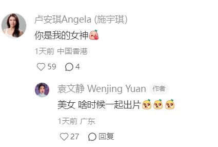 今年的港姐季军袁文静(Jane)来自上海,她近日在社交网晒出多张新发型美照,散发一种空灵感气息,港姐亚军施宇琪第一时间留言称赞:“你是我的女神。”袁文静则回复:“美女,啥时候一起出片。”