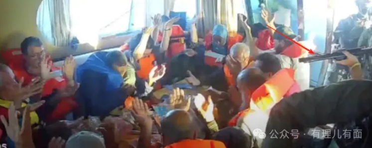 每艘船上的待遇都不同,有些人被迫戴着塑料手铐长达16个小时,不给水喝,不给食物。一个14人的房间只提供一盘食物。