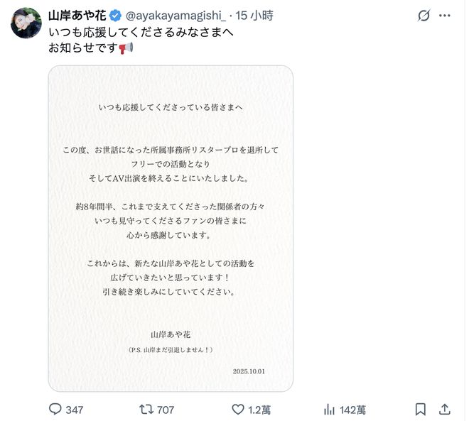 在参加完澳门的活动后,山岸あや花(山岸绮花)终于在自己的社群上发文:她说自己已经退出了事务所リスタープロ(ListarPro),也结束了拍摄的工作,未来将以自由女优的形式活动,这些年来合作的相关业者以及支持自己的粉丝,她衷心感谢,敬请期待全新的山岸あや花(山岸绮花)和大家见面: