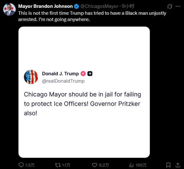 在8日与约翰逊举行的联合新闻发布会上,普里茨克誓言将利用该州掌握的“一切手段”来抵制特朗普的部署,并指责特朗普作为一个“被定罪的重刑犯”,却想要在芝加哥和其他民主党领导的城市进行“独裁游行”。他警告道:“如果你要抓我的人民,就得先通过我。所以,来抓我吧。”
