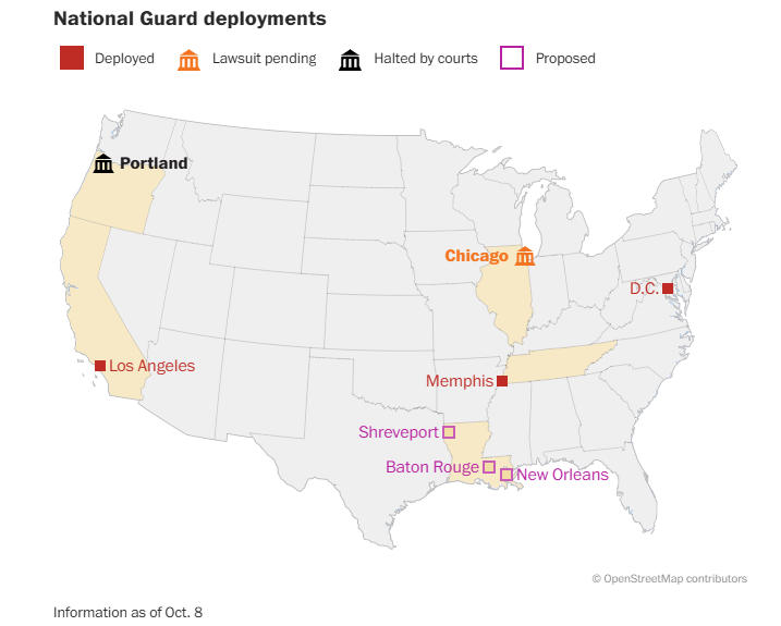 据美国《华盛顿邮报》总结,截至当地时间8日,特朗普政府已向波特兰、洛杉矶、芝加哥、华盛顿特区、孟菲斯等城市部署国民警卫队,其中波特兰的行动已被法院阻止,芝加哥市政府已上诉。