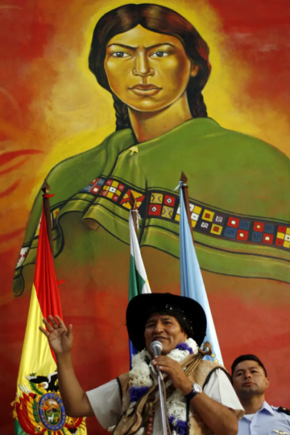 莫拉莱斯站在1780年代艾玛拉土著起义女英雄巴托丽娜·茜飒的画像下发表讲话