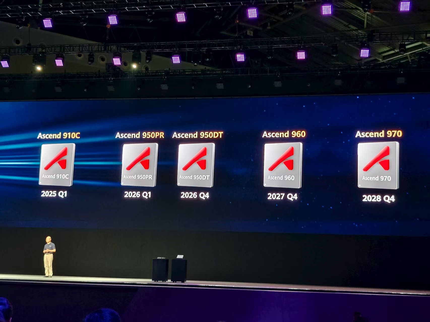 在华为全连接大会2025上,华为轮值董事长徐直军宣布了多颗昇腾系列芯片和演进路线,包括昇腾950系列、昇腾960系列和昇腾970系列。 图源:东方军事