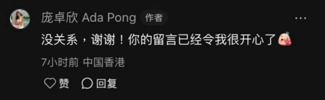 庞卓欣则回复对方:“没关系,谢谢!你的留言已经让我很开心了”,也有不少网友称赞她穿搭好看,自信十足。
