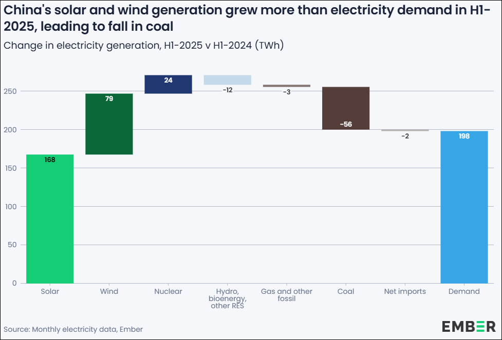 2025年上半年,中国太阳能和风能发电量增幅超过电力需求,导致煤炭发电量下降。 Ember报告截图
