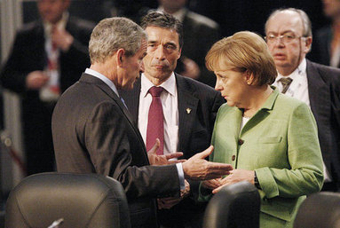 2008年的北约布加勒斯特峰会上,美国总统小布什与德国总理默克尔交谈。