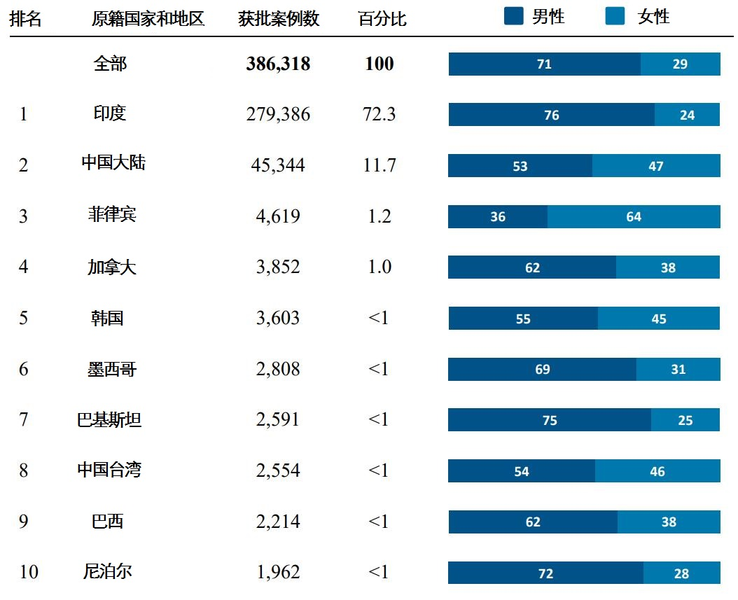 2023财年按获批人数排列的H-1B签证前十大来源地