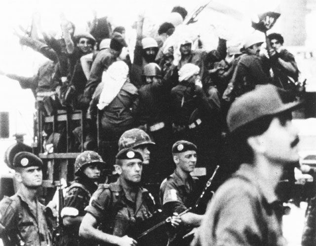 1982年,在美国海军陆战队与法国外籍军团士兵护卫下,巴解组织武装成员乘卡车撤出贝鲁特。