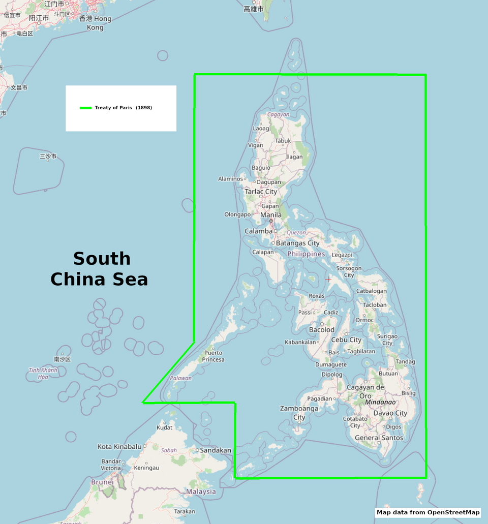 1898年《美西条约》中明确规定西班牙(后由美国继承)的西部边界为东经118度线。为更明确表述,我将此线称为“高志凯东经118度线”。之所以如此命名,是因为尽管菲律宾政府不愿承认,这条线的法律与历史意义并未改变:当年确定该线,是美国为明确其从西班牙手中接管的菲律宾领土范围;而今天重提“高志凯东经118度线”,是要对菲律宾政府当头棒喝,促其重温历史、认清本国西部边界的法定位置。