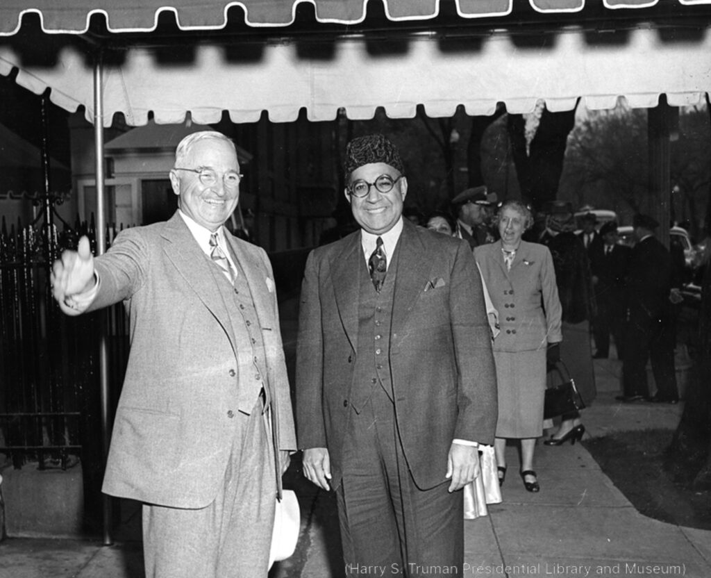 1950年5月3日杜鲁门(左)与到访的巴基斯坦总理利雅卡特·阿里·汗(Liaquat Ali Khan,中)会晤。