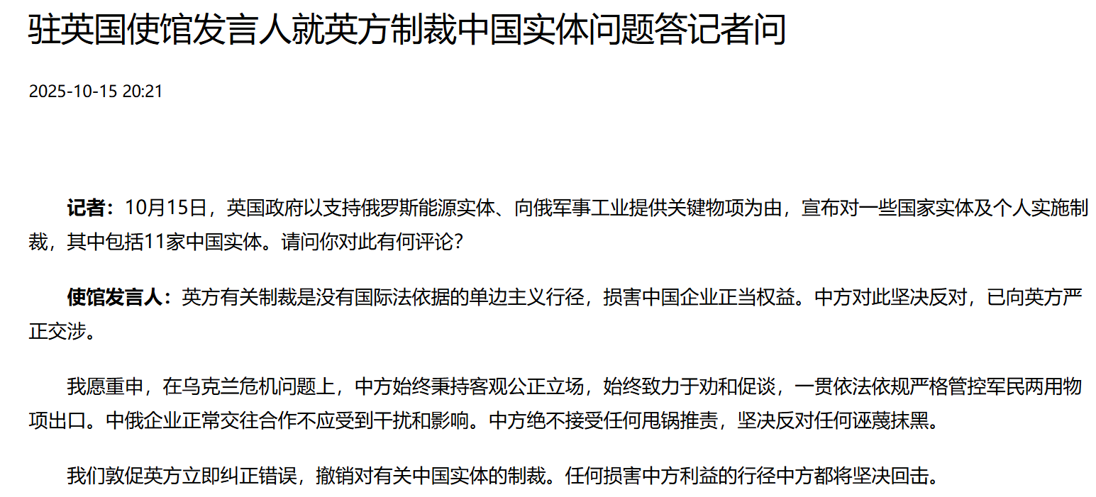 据中国驻英国大使馆网站消息,10月15日,中国驻英国使馆发言人就英方制裁中国实体问题答记者问。记者:10月15日,英国政府以支持俄罗斯能源实体、向俄军事工业提供关键物项为由,宣布对一些国家实体及个人实施制裁,其中包括11家中国实体。请问你对此有何评论?使馆发言人:英方有关制裁是没有国际法依据的单边主义行径,损害中国企业正当权益。中方对此坚决反对,已向英方严正交涉。我愿重申,在乌克兰危机问题上,中...
