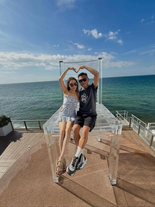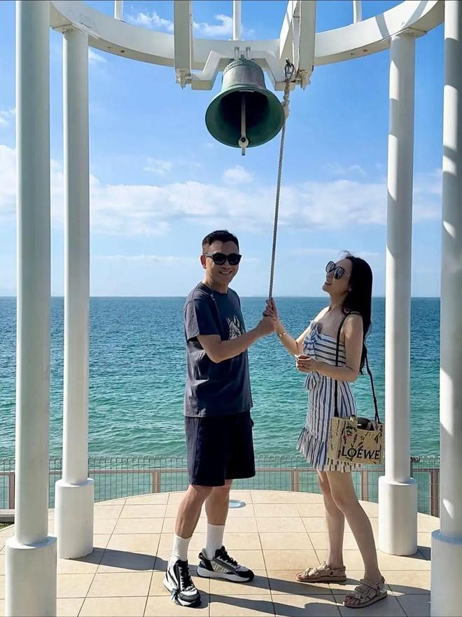 照片中,林文龙与郭可盈在蓝天白云和无敌海景的背景下,合体摆出爱心姿势秀恩爱。