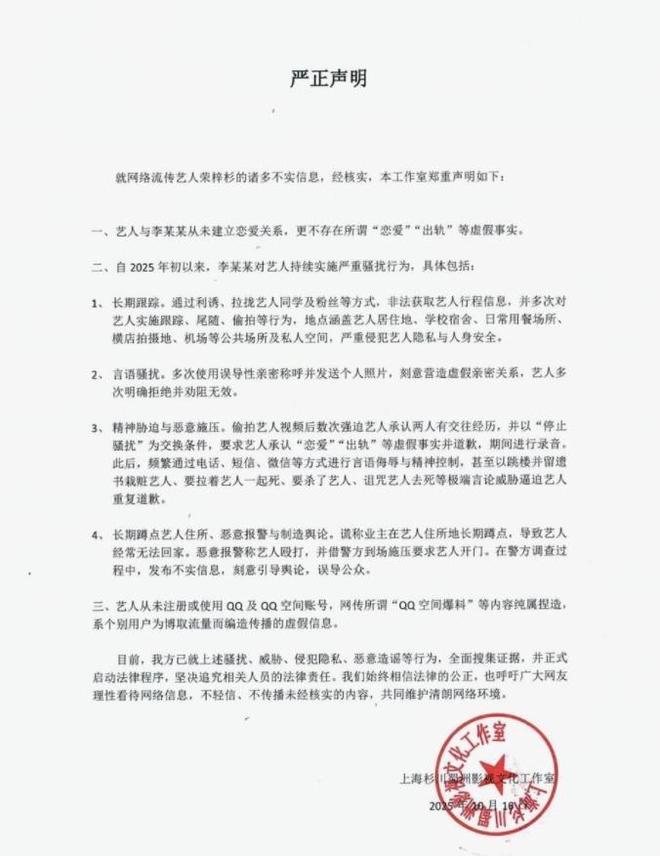 出来锤荣梓杉的是他的女朋友李禹熹,21届中戏表演班的,和荣梓杉是同学,两人谈恋爱时间没多久,奇葩事闹出一大堆。荣梓杉在谈恋爱期间就是个彻头彻尾的渣男,不仅多次出轨,脚踩多条船,还冷暴力闹分手,妥妥时间管理大师2.0.如果真的分手了也就算了,但后来莫名其妙又和女方复合,复合之后也不好好对人家,闹矛盾之后突然发疯,和女方吵架甚至开始动手。而且从头到尾都不承认和女方谈恋爱这件事,对外都称女方是跟踪她的私生。导致他的粉丝一直对女方很敌视。