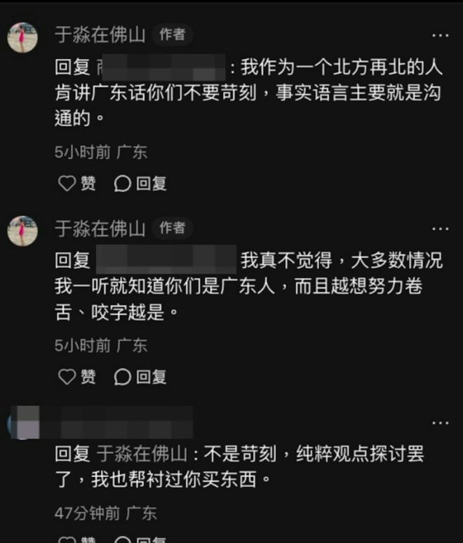 同时她强调:“我一个北方再北边的人,愿意开口讲广东话,大家就别这么苛刻了,语言说到底主要是用来沟通的。”
