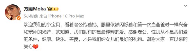 而方媛亦有转发老公发文,留言表示:“欢迎我们的小宝贝,看着老公抱着她,眼里依然闪烁着和第一次当爸爸时一样兴奋和宠溺的光芒,就知道,我们拥有 的是最纯粹的爱。感谢老公,性别从不是我们爱的条件,健康、快乐、善良,才是我们给女儿们最好的礼物。谢谢大家一直以来的关心。”
