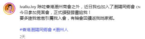 日前,廖倬竩宣布自己有了新身份,她发文透露自己加入了潮阳同乡会:“除了香港潮州商会之外,最近我也加入了潮阳同乡会,今天参加见面会,正式给我颁发了证书!要谢谢我爸爸推荐我入会,让我有机会为家乡出点力。”