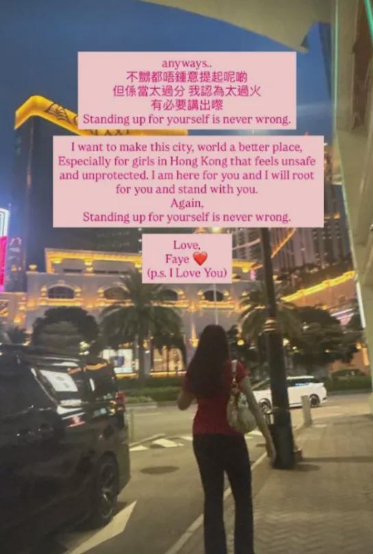 她随后又表示:“我认为太过火,有必要讲出来。为自己发声永远没有错。”她还特别提到希望为香港的女性发声:“我希望令这个城市、这个世界变得更美好。特别是为了那些在香港感到不安全和没有受到保护的女孩子们。我会支持你,与你同在。重申,为自己发声永远没有错。”