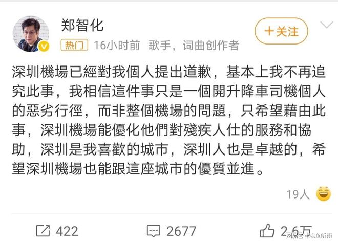 10月25日的时候,歌手郑智化在社交平台发文,怒斥深圳机场对残疾人“没人性”,他称当天乘坐航班时,机场安排远机位不说,升降车离机门地板还有25公分,自己轮椅推不进去、腿也跨不进,司机还不顾安全不愿调升降板,只能“连滚带爬”进飞机。