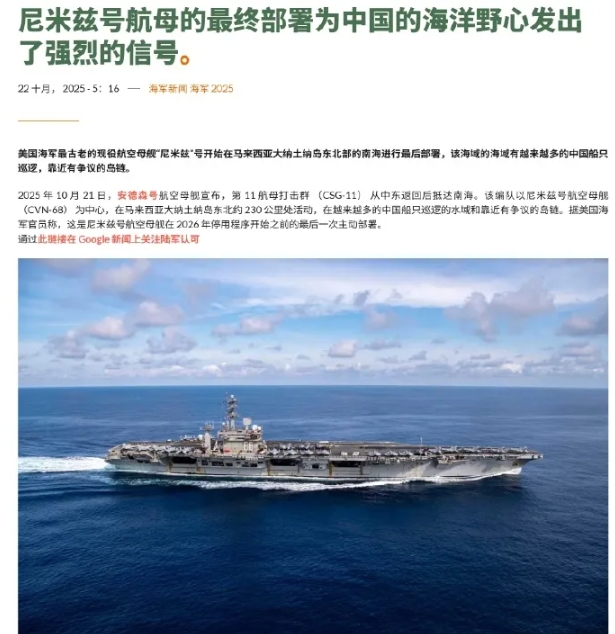 就在10月22日,美媒刊发了一篇文章,标题是《尼米兹号航母的最终部署,对中国的海洋野心发出了明确的信号》!