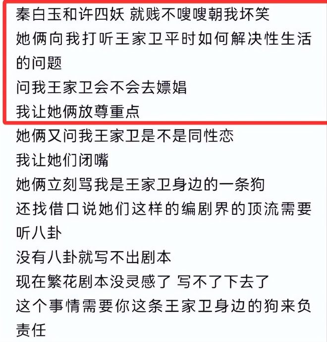 古二这招成功分裂了王家卫和秦雯、许思窈的联盟,也能看得出来,这几位人品确实不怎么样,无差别背后蛐蛐所有人,感觉这些年和他们合作过的,应该都没逃过他们的闲言碎语。